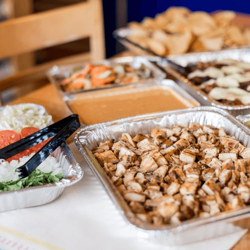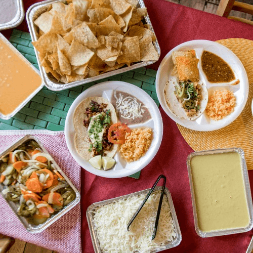 Catering orders require a minimum of 10 people. Chicken or steak, rice, beans, sour cream, cheese, chips, six different types of salsa, and your choice of flour or corn tortillas.