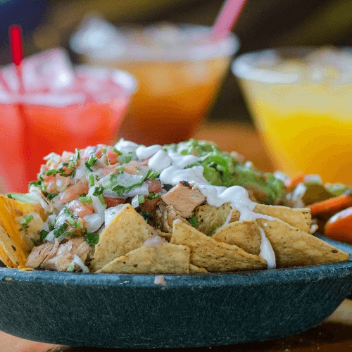 Corn chips covered with cheese sauce, beans, lettuce, jalapeños, guacamole, pico de gallo, and sour cream