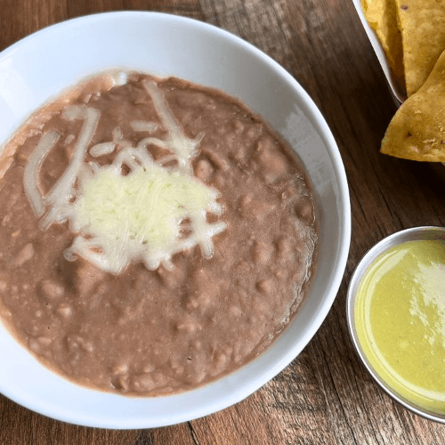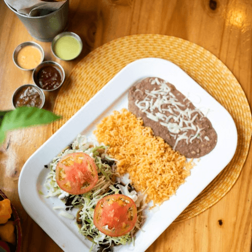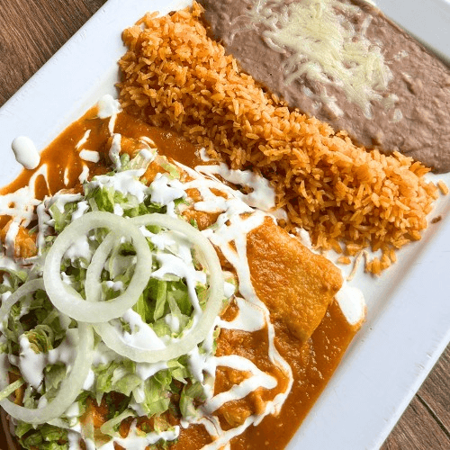 Four corn tortillas filled with chicken or cheese, covered with your choice of green tomatillo salsa, red tomato salsa, or mole salsa. Topped with melted cheese, lettuce, onion, and sour cream. Served with a side of rice and beans