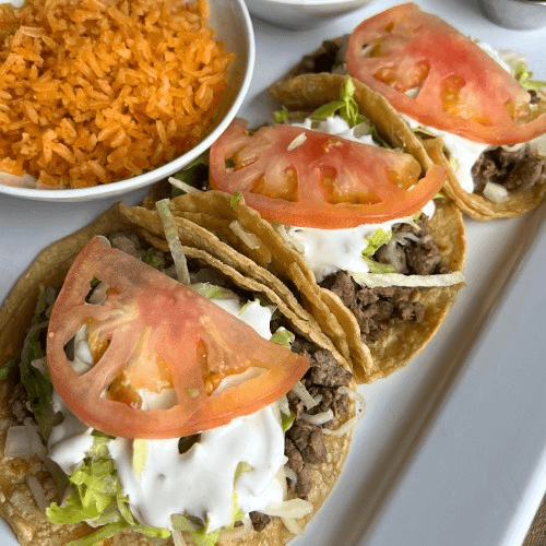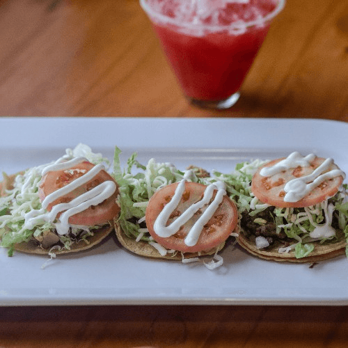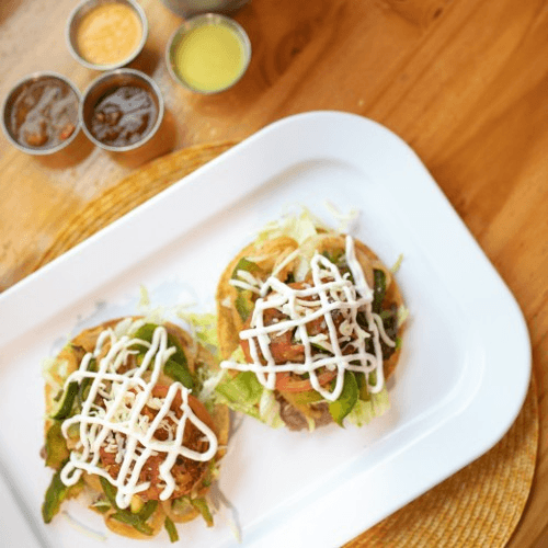 Corn or flour tortillas topped with lettuce, tomatoes, onion, cheese, sour cream and your choice of meat: Steak, Cecina, Chicken, Chorizo, Pork Chop, or Vegetarian. Lengua, Tripas, or Cochinita Pibil.