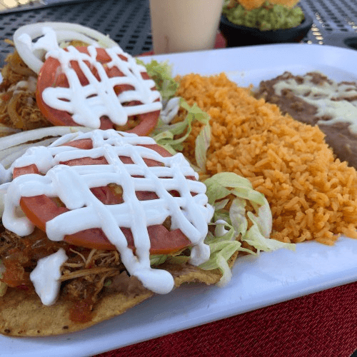 Flat crispy corn tortilla topped with beans, lettuce, tomato, onion, cheese, sour cream, and your choice of meat: steak, cecina (cured steak). Chicken, carnitas, chorizo, pork chop, tinga (marinated shredded chicken), tripas, vegetarian, lengua