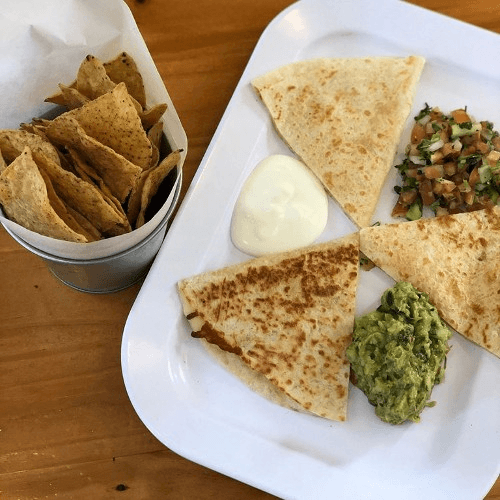Flour tortilla filled with cheese and served with pico de gallo, guacamole, and sour cream