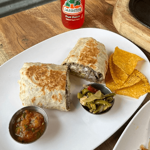 Beans, lettuce, tomato, cheese, sour cream and your choice of meat wrapped in a big flour tortilla: steak, cecina (cured steak), chicken, carnitas, chorizo, pork chop, tripas, al pastor, vegetarian, lengua or cochinita pibil