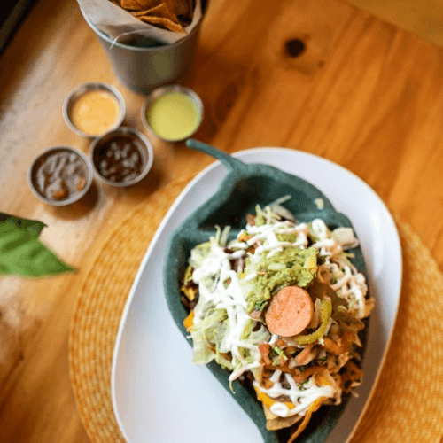 Corn chips covered with cheese sauce, beans, lettuce, jalapeños, guacamole, pico de gallo, and sour cream, served with your choice of meat: steak, cecina (cured steak), chicken, carnitas, chorizo, pork chop, tripas, al pastor, vegetarian, lengua