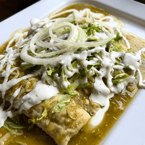Four corn tortillas filled with chicken or cheese covered with mild green tomatillo salsa and topped with cheese, lettuce, onion, and sour cream