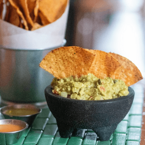 Catering-size guacamole is 32 oz. and served with fresh tortilla chips on the side.