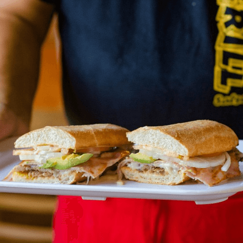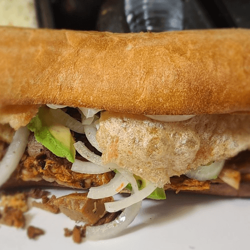 Bolillo baked to order (traditional mexican bread) served with mayo, refried beans, avocado, tomato, onions, cheese and your choice of meat: milanesa (breaded steak), ham, ham and melted cheese, steak, cecina (cured steak), chicken, carnitas, chorizo, pork chop, tripas, vegetarian, lengua
