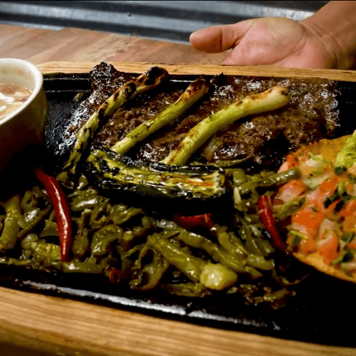 Grilled skirt steak, grilled onion, hot peppers, cactus, guacamole, pico de gallo, frijoles de la Holla all served on a sizzling plate with your choice of flour or corn tortillas